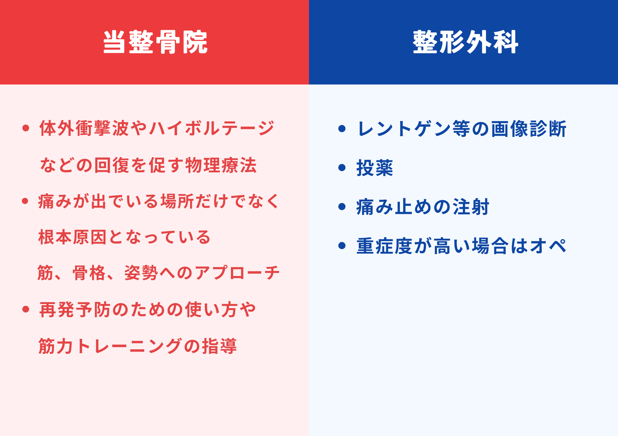 整形外科での診断と、整骨院での身体全体へのアプローチを適切に使い分け・併用することが、早期改善と再発予防につながります。