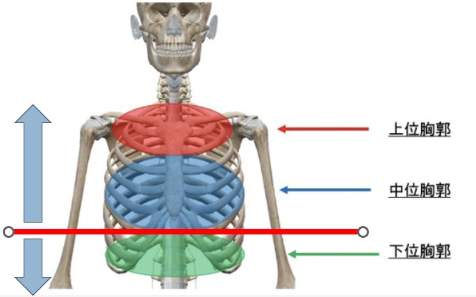 本来胸郭は3つの区画に分かれており上・中位胸郭は同じ動きをし、下位胸郭と骨盤が同じ動きをするものです。【赤ラインから上と下では別の動きをするということです】